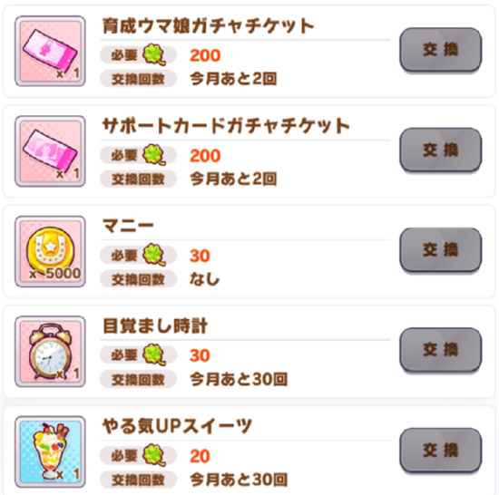 2.马蹄铁,可以通过卖重复的支援卡获得,不同等级的支援卡卖得的马蹄铁也是不一样的,SSR支援卡可得彩虹蹄铁、SR支援卡可得金蹄铁、R卡可得银蹄铁,每一个等级蹄铁能兑换的商品也是不一样的。