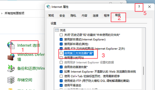 2、 点击“Internet 选项”,在弹出的窗口中选择“高级”选项卡,往下拉,找到“启动第三方浏览器扩展”将这个选项前的勾去掉,点击右下角的应用