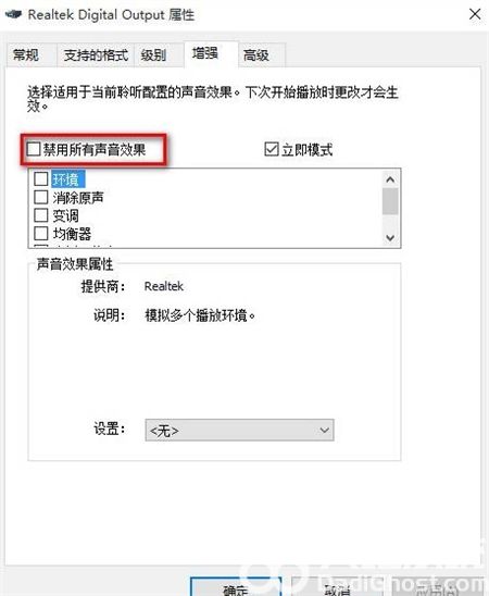 3、切换到【增强】选卡,将会里面的所有特效的勾选都去掉,点击应用—确定。