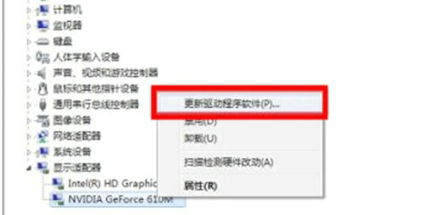 4、点击“显示适配器”,右键显示驱动,选中“更新驱动程序软件”;