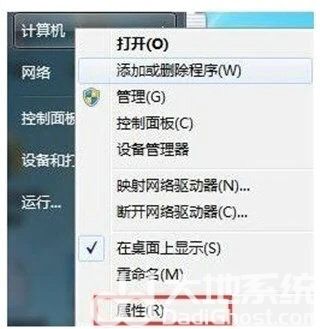 2、若还没有恢复则检查显示驱动是否正常,左键点击桌面左下角开始菜单,然后右键“计算机”选择“属性”;