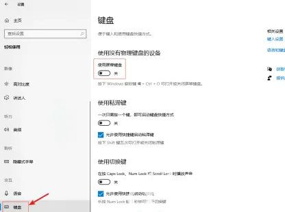 3、在左侧下拉找到并点击【键盘】,右侧打开【使用屏幕键盘】即可调出软键盘使用