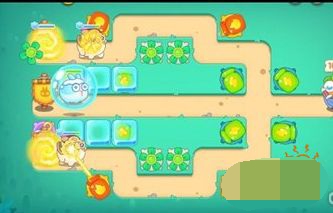1.开局六个瓶子炮,最左边一列的两个瓶子炮满级,用来清障碍,离萝卜最近的瓶子炮也满级,用来清怪物,冰冻怪会在中间一列炸开冻住,所以中间一列瓶子炮不用管。