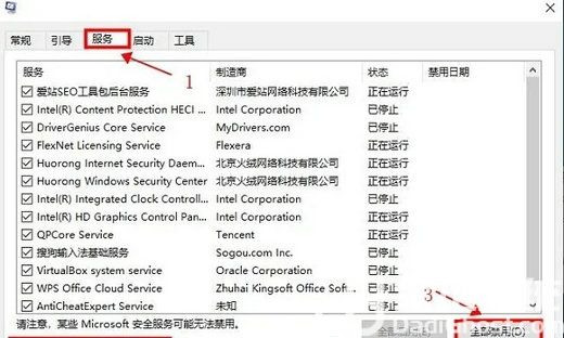 2、在打开的界面中点击上方的“服务”,然后点击左下方”隐藏所有microsoft服务”,最后单击“全部禁用”即可;