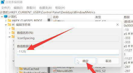 3、找到“conSpacing”和“IconVerticalSpacing”,将数据修改为-1125,最后重启电脑即可