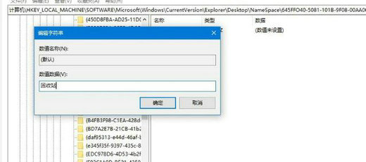 5、点击该新建项,双击右侧的“默认”修改其数值数据为“回收站”。