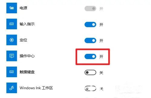 4、在系统图标中找到【操作中心】,然后点击右侧的滑块,将该功能开启即可;