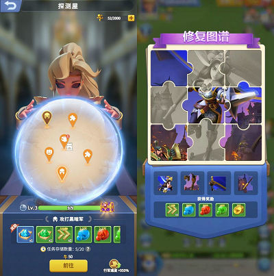 2、修复图谱:每次消耗100行动力,完成拼图即可完成挑战,额外奖励加速道具和资源。