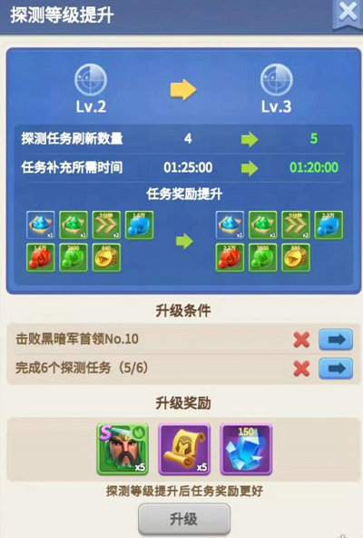 二、探测任务可升级,需达到一定任务数量和黑暗军首领挑战进度的前置条件,升级后探测任务奖励随之提升,并且获得青龙武圣碎片、钻石和高级英雄招募券的升级奖励
