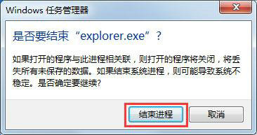 5、系统弹出确认菜单,点击结束进程,这时系统桌面所有图标都会消失,没关系,马上修复;