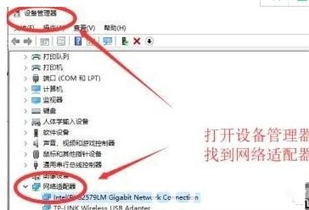 6、下一步,打开电脑的【设备管理器】功能,然后在下面找到【网络适配器】功能,点击展开。