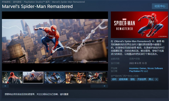 漫威蜘蛛侠是一款由失眠组制作索尼发行的蜘蛛侠游戏,目前已经上架了steam并且开启了预售,国区首发价格378rmb。