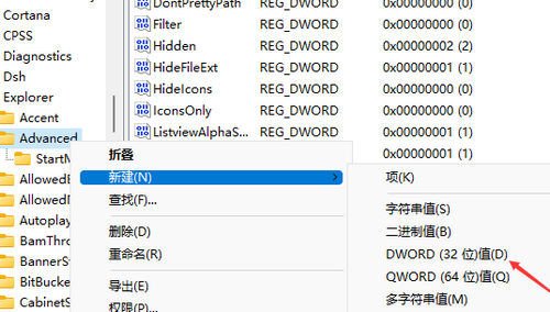 3、右击Advanced,选择新建一个“TaskbarSi”的DWORD值