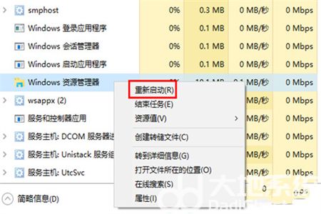 6、最后找到“Windows资源管理器”,右键重新启动即可。