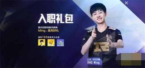 首充领取辅助SSR选手自选包*1(22夏Ming、Meiko、Mark、Missing、Crsip ),以及超值首充福利。