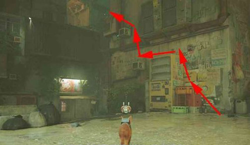 离开Clementine的公寓,往Momo公寓的方向走,回到之前那两个搬油桶的机器人处,向右看,对面的阳台上有一个外界者标志,往那边走。