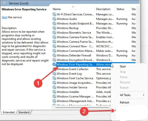 2、在“服务”窗口中,右键单击右窗格中的Windows 错误报告服务,选择“属性”