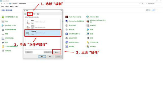 在弹出窗口中,选项卡选择【录制】- 单击【立体声混音】-【属性】
