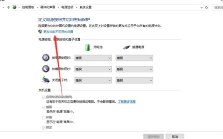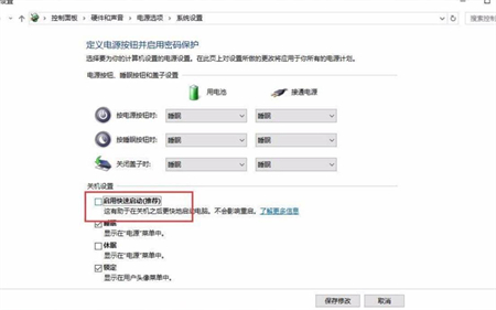 但是可以发现里面的”快速启动“是灰色无法修改的,需要点一下上方的“更改当前不可用的设置”