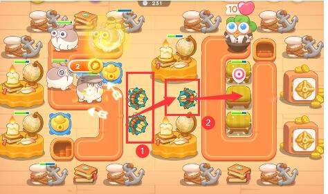 1、开局先在兔子出口放置元宝即可积累财富,选好清理建筑物炮台