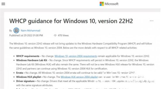 与此同时,微软在另一篇用于帮助商业客户和公司部署 Windows 10 的博客文章明确指出,22H2 版的 Windows 硬件兼容性计划 ( WHCP ) 没有变化,甚至与 2004 版本完全相同。
