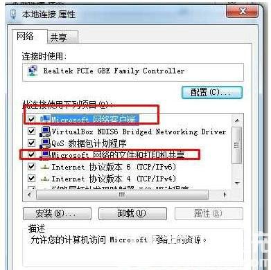 4、勾选上 "Microsoft 网络客户端" 和 "Microsoft 网络的文件和打印机共享" ,问题就解决了