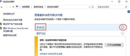 3、进入“安全性与维护”的页面后,点击“安全”向下的箭头图标。