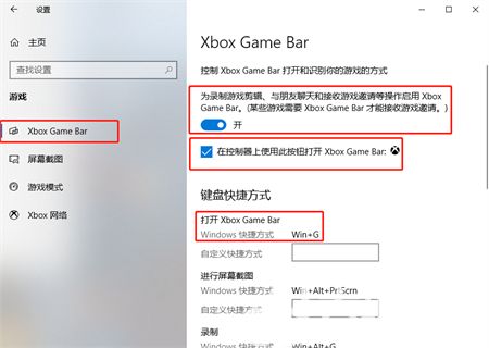 2.然后,在“游戏”窗口中,选择左侧的“Xbox Game Bar”,并在右侧找到且勾选“开”和“在控制器上使用此按钮打开Xbox Game Bar”