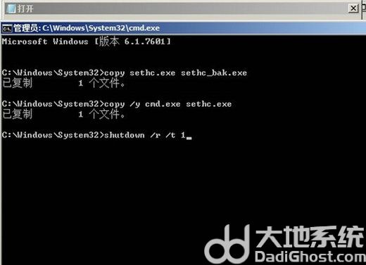 9、在新出现的页面依次输入【copy sethc.exe sethc_bak.exe】,【copy /y cmd.exe sethc.exe】,按下回车。之后输入【shuot down /r /t 】,如图九。最后按下回车电脑会自动进行重启;
