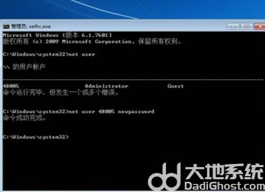 11、在新页面中输入【net user】,这时候系统会出现登录用户名,我们记下用户名。接着输入【net user 刚才记下的用户名 新的密码】,之后按下回车,开机密码就完成重置了。8005就是用户名,newpassword就是新密码。