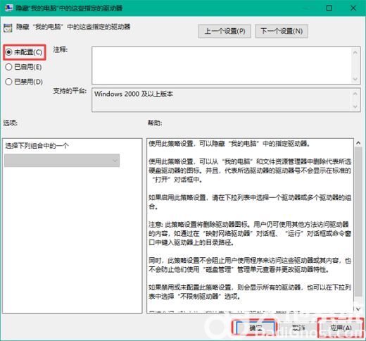 第六步,接着系统会弹出【隐藏我的电脑中的这些指定的驱动器】的窗口,然后我们选择【未配置】选项,然后点击【应用】按钮,再点击【确定】按钮即可。