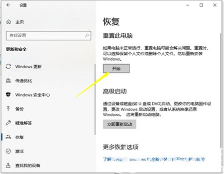 2、左侧栏找到“恢复”点击右边的“重置此电脑”选项,点击“开始”按钮就可以进入到还原出厂设置的过程了,按照提示选择相关操作即可。