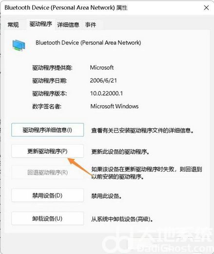 3、Bluetooth Device (Personal Area Network) 属性窗口,选择【驱动程序】选项卡,然后点击下面的【更新驱动程序】;