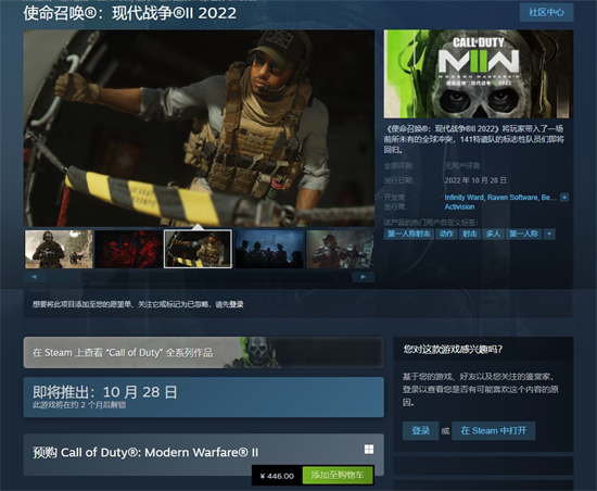动视官方公布了《使命召唤19:现代战争2》的预告,并确定游戏将于10月28日发售,现已开启预购,游戏登录PS4|5、XSS|X、Xbox One和PC(steam 战网)。Steam国区标准版售价446元,支持简体中文。预购任意版本的玩家可以提前参加《使命召唤19》公开试玩。