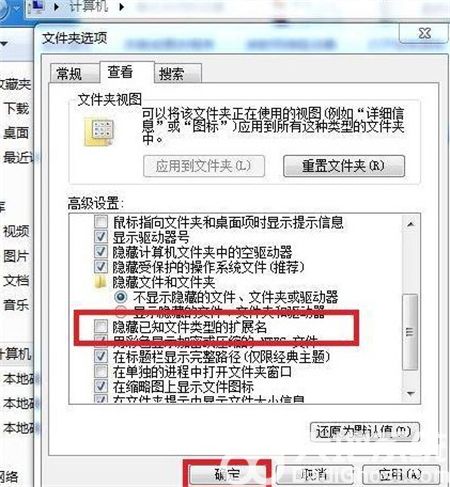 4、在高级设置中将滚动条拉到最底部,将“隐藏已知文件类型的扩展名”前面的勾去掉,点击确认