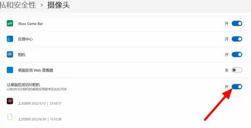 3、开启让桌面应用访问相机,这样就开启摄像头权限成功。