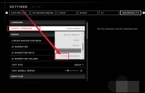 3.最后在【ACCESSIBILITY】设置界面选择【VISUAL LANGUAGE】并点击【CHINESE】就可以成功设置中文。