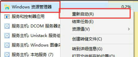 7、最后打开我们的任务管理器,找到其中的“资源管理器”,右键选择“重新启动”即可。