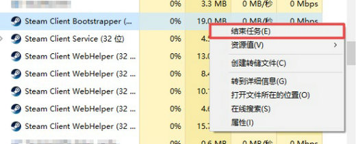 2、然后找到所有steam进程,将他们全部“结束任务”