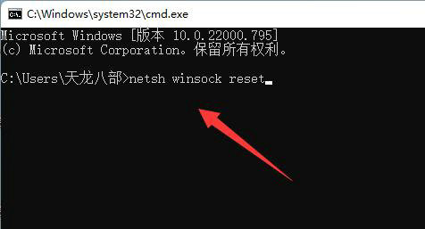 3、打开后输入“netsh winsock reset”回车再重启电脑试试看应该就可以了。