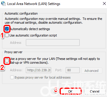 第 3 步:在局域网 (LAN) 设置窗口中,选中与自动检测设置对应的复选框。