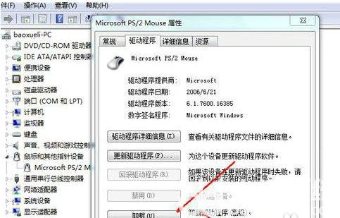 5、在鼠标属性页中,有关于驱动程序的详细信息,在最下面是一个卸载按钮,这就是卸载驱动的按钮,用鼠标点击这个卸载按钮,卸载当前的鼠标驱动;