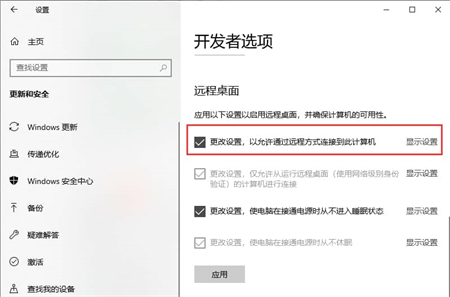 5、在开发者选项下面找到远程桌面,并点击“更改设置,以允许通过远程方式连接到此计算机”后面的“显示设置”选项。
