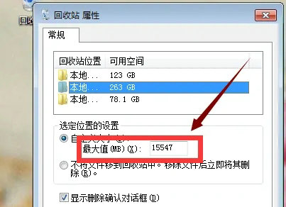 选择好硬盘以后,我们可以在下发的自定义大小里面输入自己想要为回收站分别的大小,如图示。