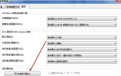 3、在颜色管理页面高级标签面下面,有一个显示器校准的功能栏,其中有一个校准显示器的功能按钮,点击一下这个按钮开始校正显示器。