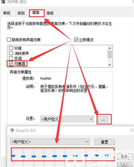 4、然后我们在上方切换到【增强】选项卡,我们可以勾选【均衡器】,然后点击下方的【···】进行设置,整体一致向上调试,音量就会变大了。