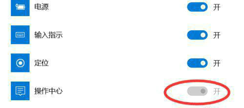 1.让我们先查看在设置窗口中的操作中心的开关是灰色的,现在你不能点击,你无法打开它。