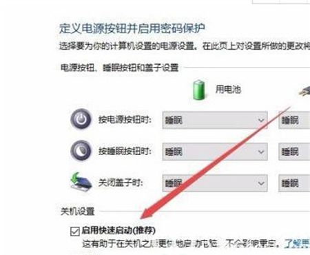 6、这时可以看到下面的“启用快速启动”一项可以编辑了,取消前面的勾选,最后点击确定按钮,重新启动电脑,以后就不会再出现关机后电源指示灯还亮的问题了。