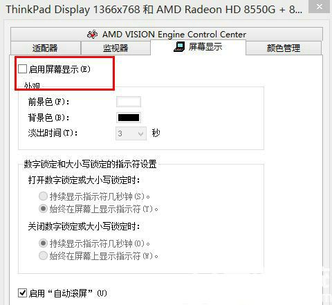 4、第四,在“屏幕显示”的窗口中的左上角有一个“启用屏幕显示”,取消勾选“启用屏幕显示”;