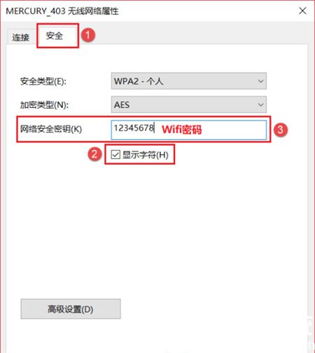 5、先点击【安全】选项卡,然后勾选“显示字符”,在“网络安全密钥”后的框中就可以看到你已连接的WIFI密码了!